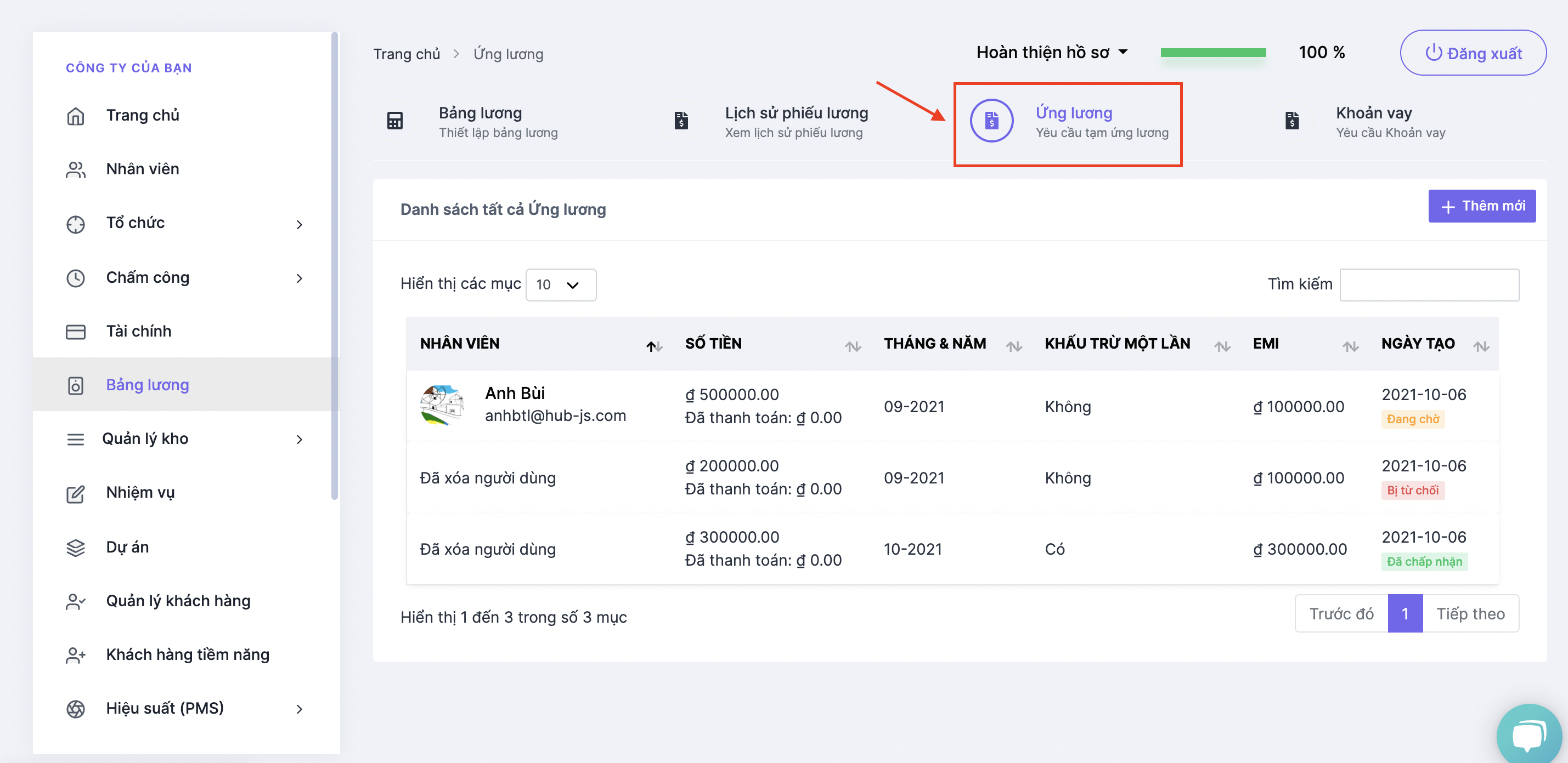 Sau đó, màn hình sẽ hiển thị Bảng yêu cầu ứng lương như sau